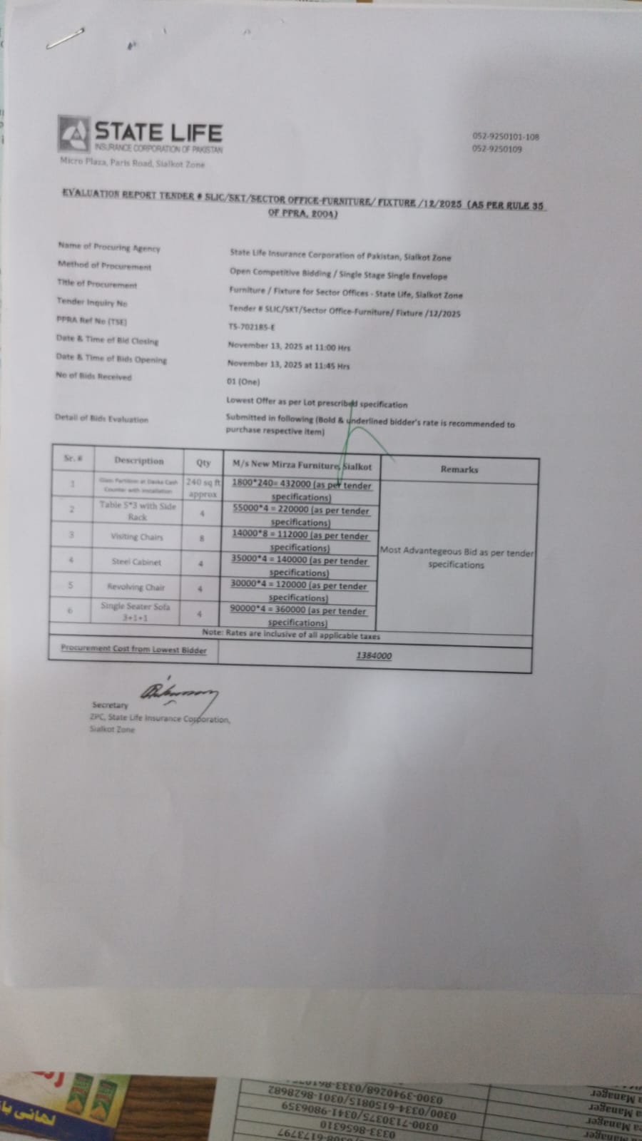 | SLIC/SKT/Sector Office-Furniture/ Fixture /10/2025 | Sialkot Zone | Sector Office-Furniture/ Fixture | 21/10/2025 | 10/11/2025 | 11:00 AM |